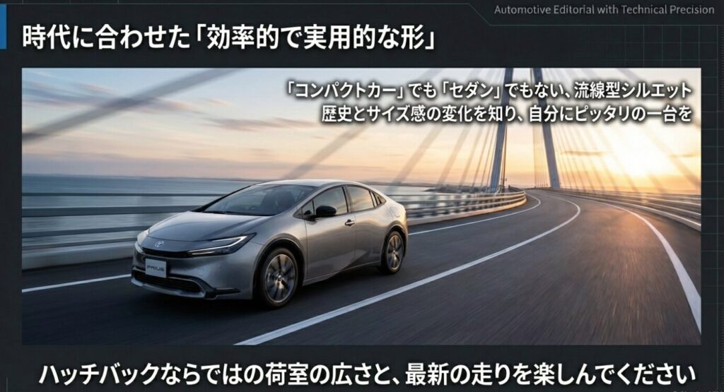 「コンパクトカー」でも「セダン」でもなく、時代に合わせて最も効率的で実用的な形を追求した結果が、今のプリウスの流線型シルエットなんですね。